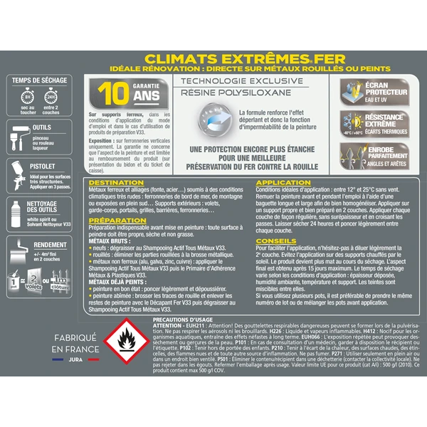 Cette peinture Fer Climats Extrêmes® a été spécialement conçue pour peindre des pièces en métal soumises à des conditions climatiques très rudes.